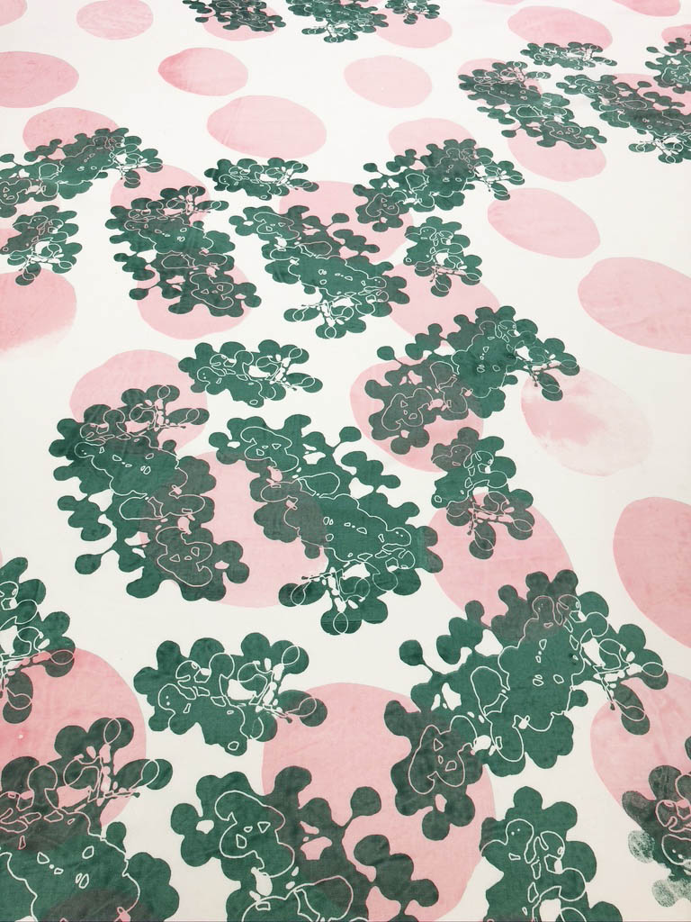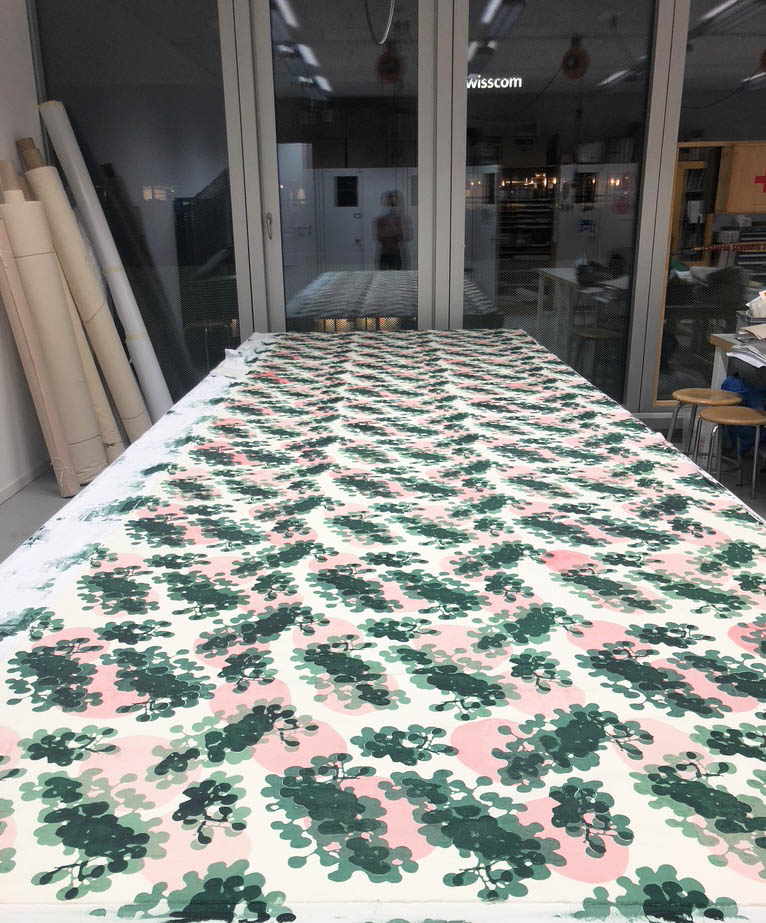 The abstract grape motif was based on a series of photograms developped in Summer 2020, tracing the lush vines surrounding the barn. This in situ approach reflects the client's wish for a site specific design realisation and is intended to promote circular thinking through the incorporaton of local handcraft and sustainable materials.