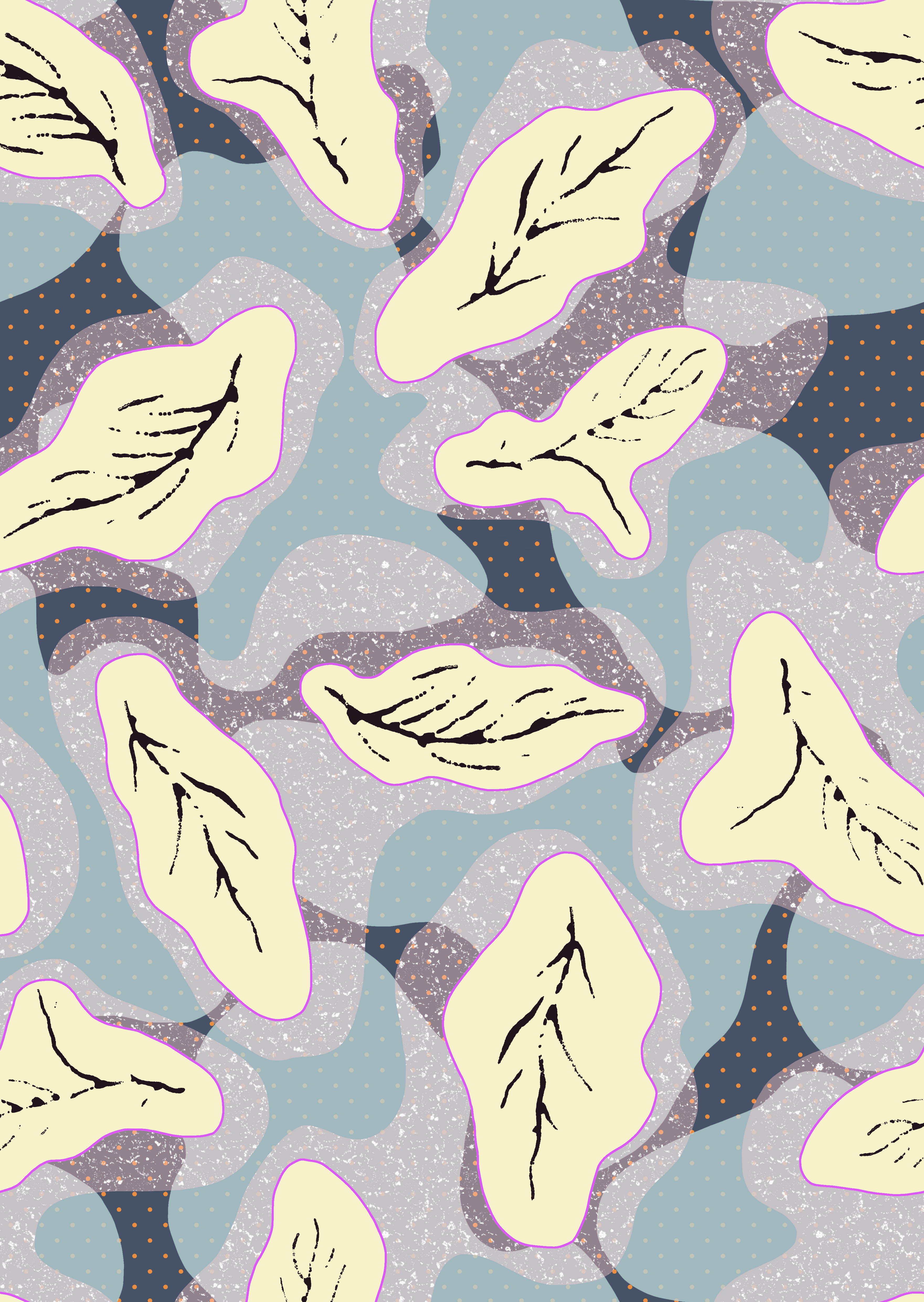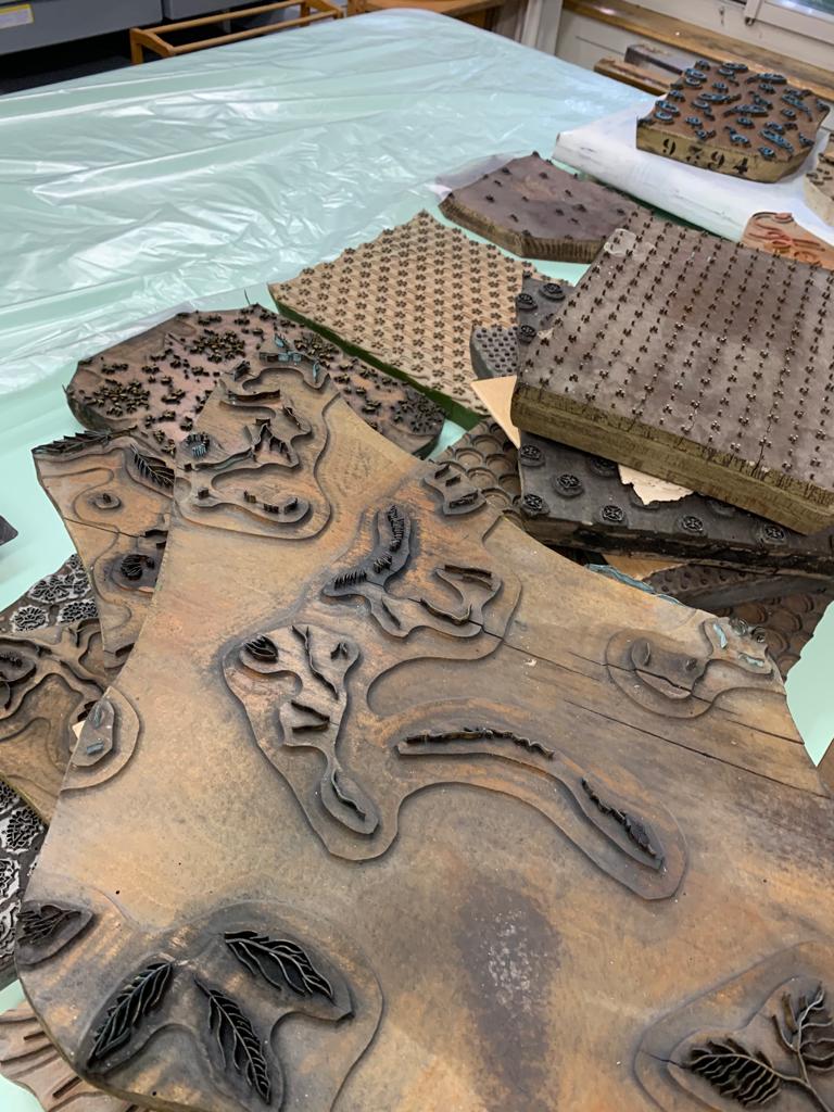 These textile repeats, commissioned by Schweizerische Textilfachschule STF, were inspired by a visit to Swiss Textile Collection's historic archives. The design process involved reprinting the archive's wooden clichés on paper and scanning them in afterwards to create a digital pattern hybrid. The grainy aesthetic of the paper prints as well as the undulating lines of the curved wood blocks both informed the motifs selected and transformed in this digital mash-up series.